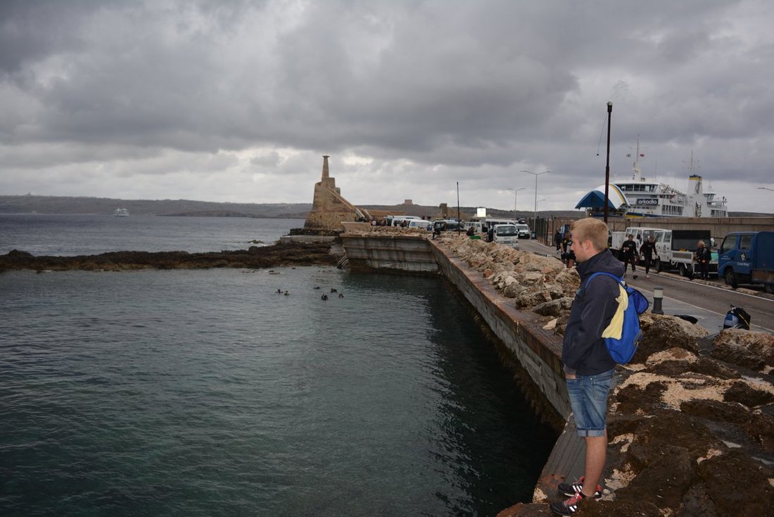 In Cirkewwa angekommen stellten wir fest, dass der Abfahrtsort der Fähre wegen des Wetters verlegt worden war. Zu Fuß durch den Regen zum Abfahrtsort. Dort gelangten wir in die Fähre, die uns nach Gozo brachte. Wegen des Wetters durfte sich niemand auf Deck aufhalten.