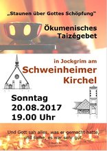 Am Sonntag, den 20.08. findet in Jockgrim am Schweinheimer Kirchel um 19 Uhr die Taizéandacht "Staunen über Gottes Schöpfung" statt. Herzliche Einladung an alle Interessierten.