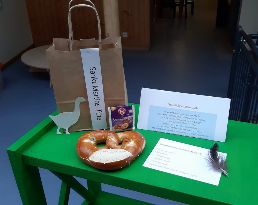 Am Abend des Martinstages trafen sich die Kinder, Geschwisterkinder und Eltern der KITA Arche Noah um miteinander einen Martinszug rund um die KITA zu machen. Die Erzieherinnen hatten den Martinstag liebevoll vorbereitet. Jedes Kita-Kind bekam am Ende des kleinen Umzuges eine Martinstüte. Die Grundschüler hatten die Tüte bereits am Vormittag erhalten. Eine Gebrauchsanleitung für die Tüte, eine Brezel, kleine Gansfigur, ein Federchen, die Martinsgeschichte und einen Teebeutel. Es war eine schöne Aktion, um an den Hl. Martin zu erinnern. HM