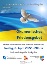 Das 2. ökumenische Friedensgebet findet am Freitag dem 8. April um 20 Uhr in der Ludowici-Kapelle in Jockgrim statt.