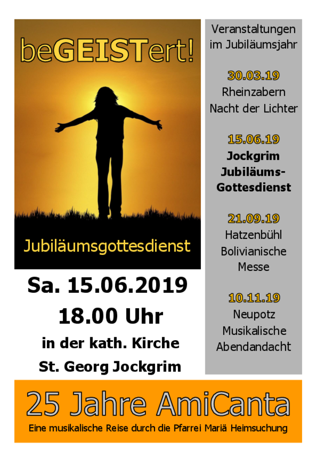 Das Jubiläumsjahr von AmiCanta geht weiter. Nach der Nacht der Lichter im März in St. Michael in Rheinzabern folgt nun der Jubiläumsgottesdienst beGEISTert! Am Samstag, den 15.6. findet um 18 Uhr in St. Georg in Jockgrim der Gottesdienst statt. Herzliche Einladung an alle Interessierten.