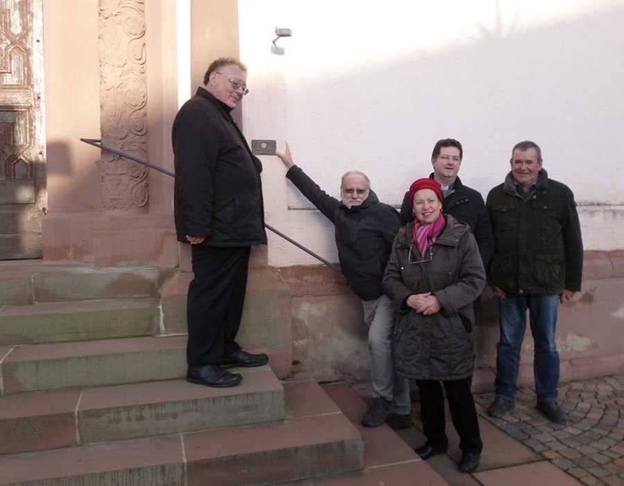 Bronzeplakette Pfr. R. Hund, H. Magin, R. Cheret (Kuratorin der Deutschen Stiftung Denkmalschutz, Pfr. M. Richtscheid, Ortsbürgermeister R. Bellaire